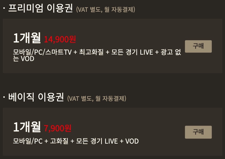 - 프리미엄 요금제 : 16,390원/월 (부가세포함가) 모바일/PC/스마트TV(삼성, LG)에서 1080 최고화질로 시청가능.